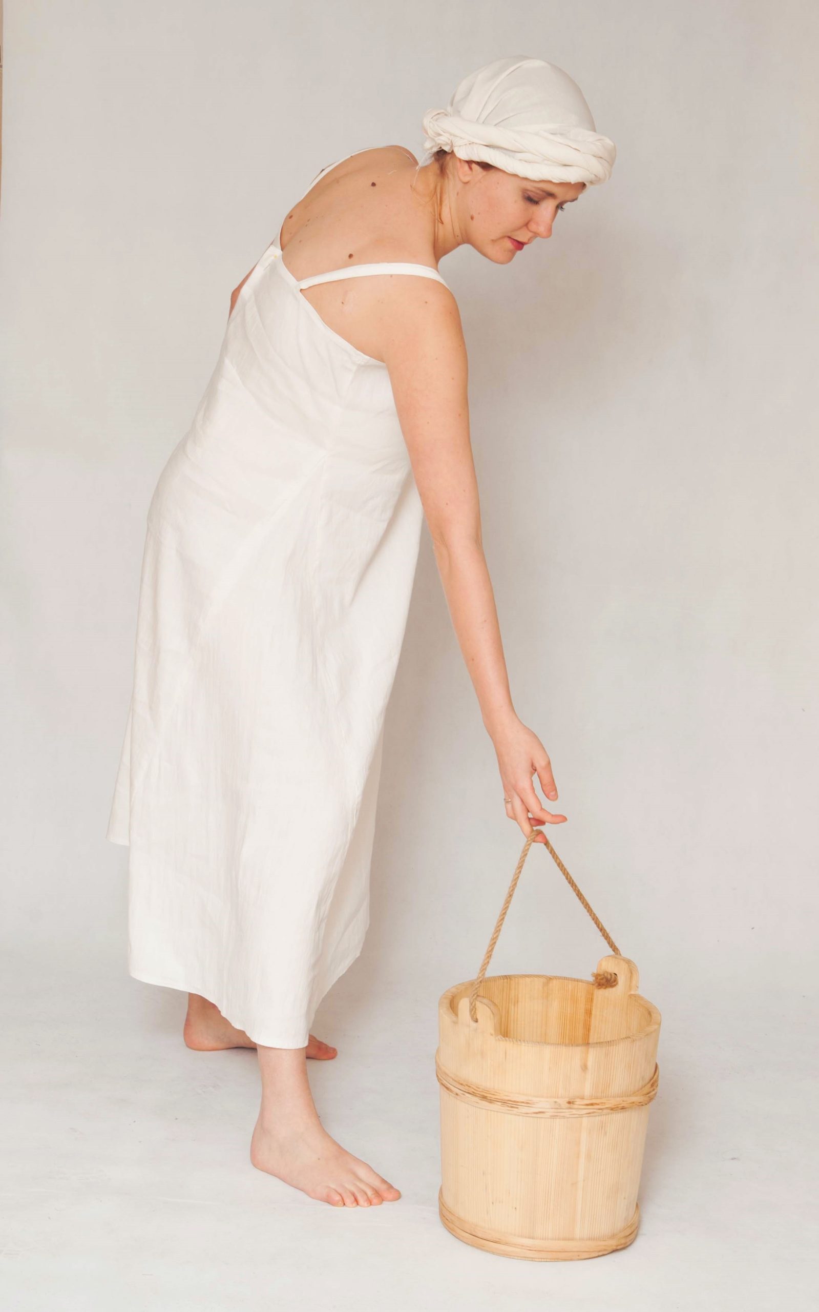 The shirt is cut from two rectangles, widened with gussets. This type of medieval undergarment has narrow straps and a more form-fitting cut.