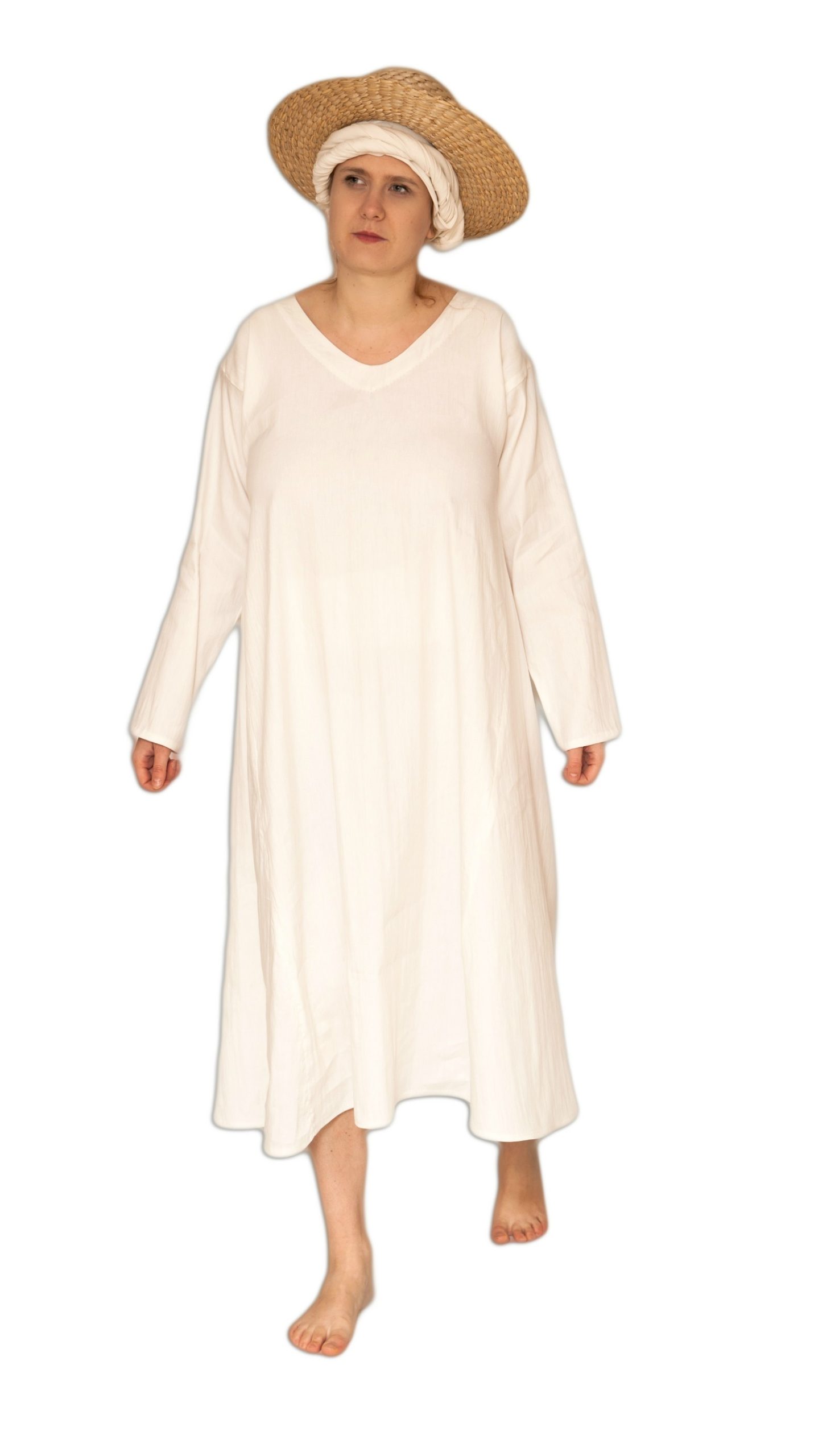 Known since the early Middle Ages, the chemise was made of bleached or natural linen. It was easy to wash and protected more expensive outerwear from stains. Its cut was simple: long sleeves, no waistband, and ankle-length or shorter. It appears in many historical sources.