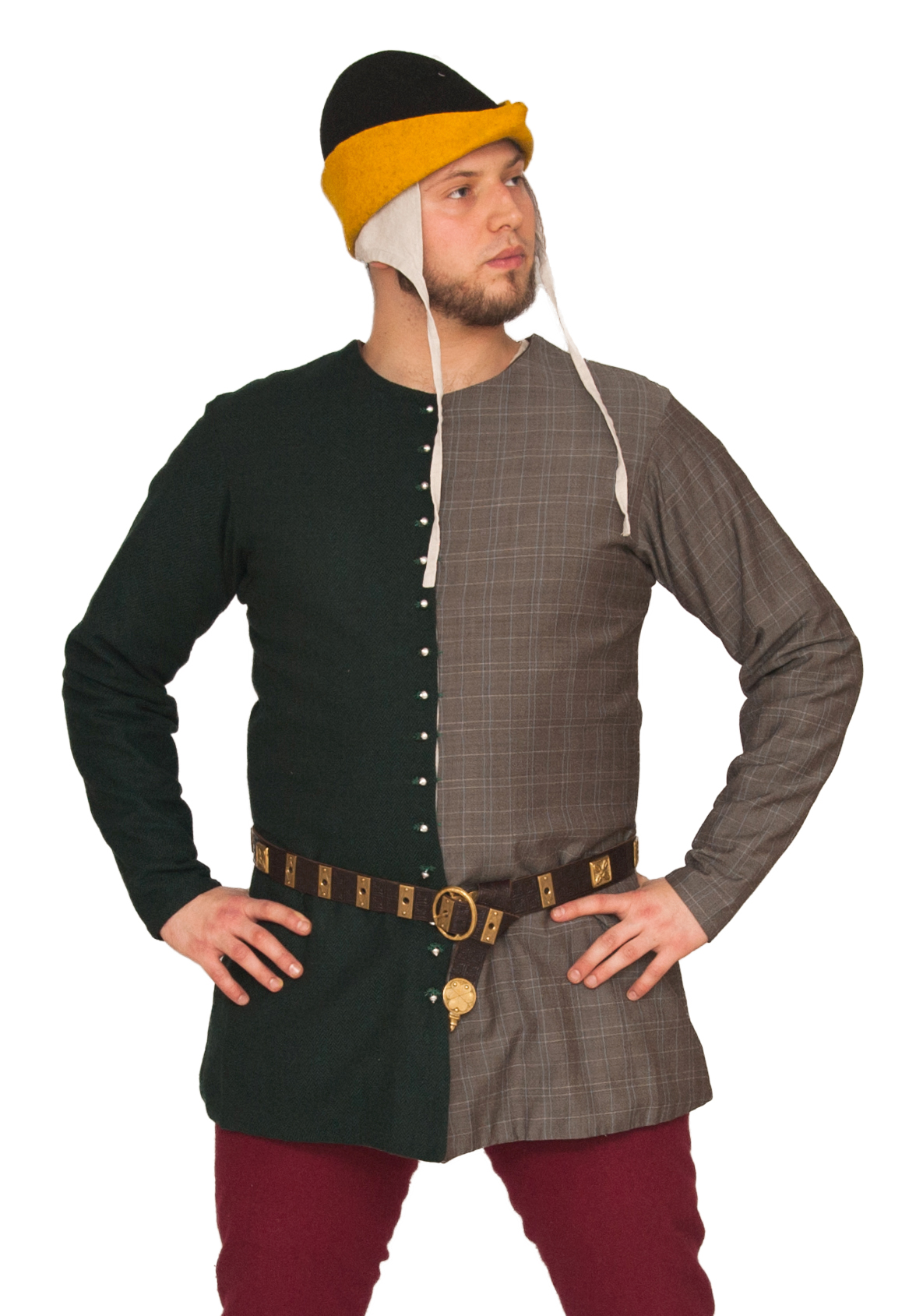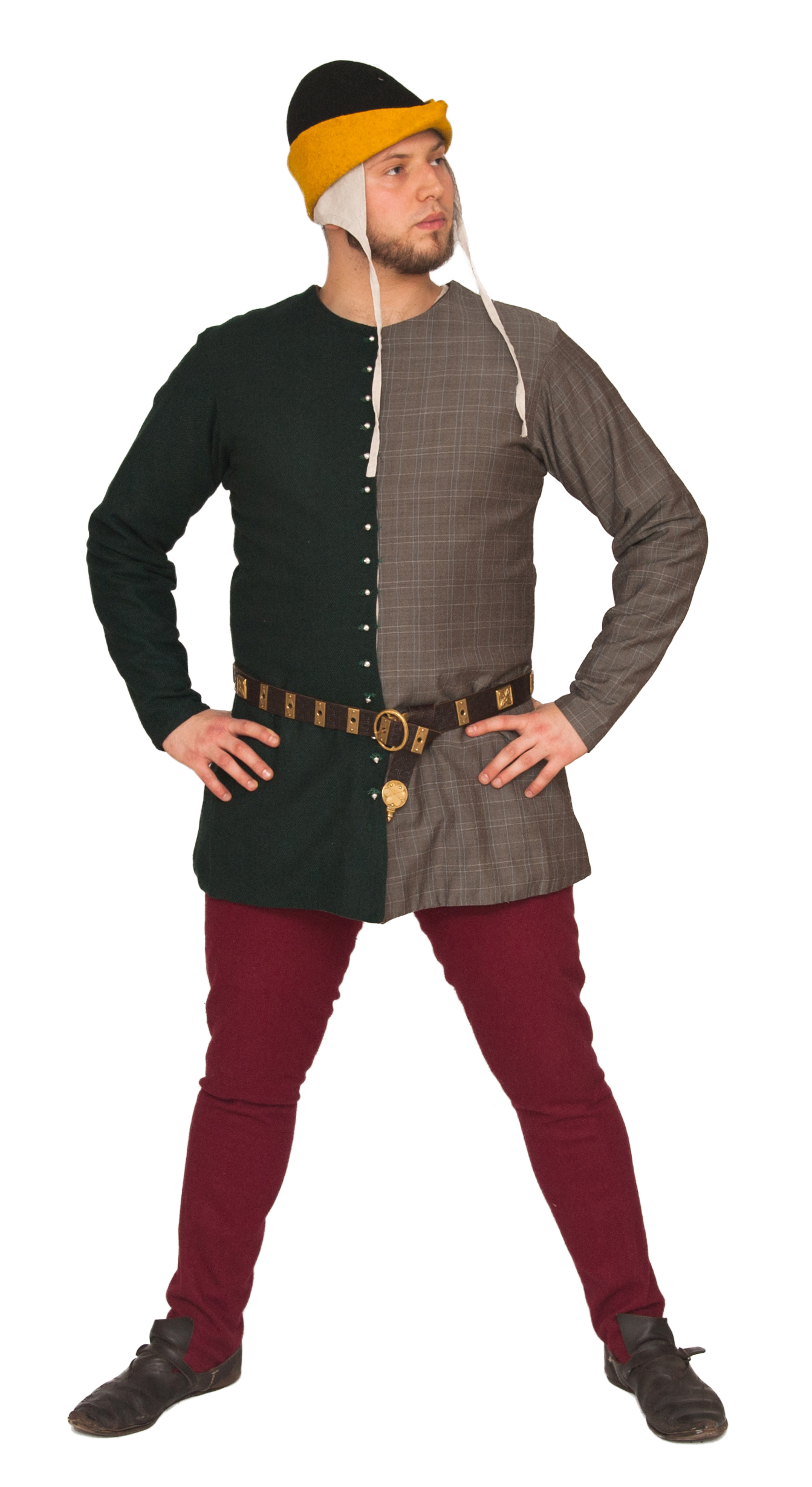 The cottehardie was a tight-fitting garment with a fitted cut, accentuating the silhouette. Over time, it became increasingly shorter. Richer versions used luxurious fabrics such as velvet or cloth, adorned with embroidery, fur, or trim. The cottehardie could be worn alone or under a cloak and became a symbol of elegance and sophisticated men’s fashion in the late Middle Ages. It was also often worn with tippets, decorative, long, narrow strips of fabric sewn to the sleeves or hems of medieval robes.