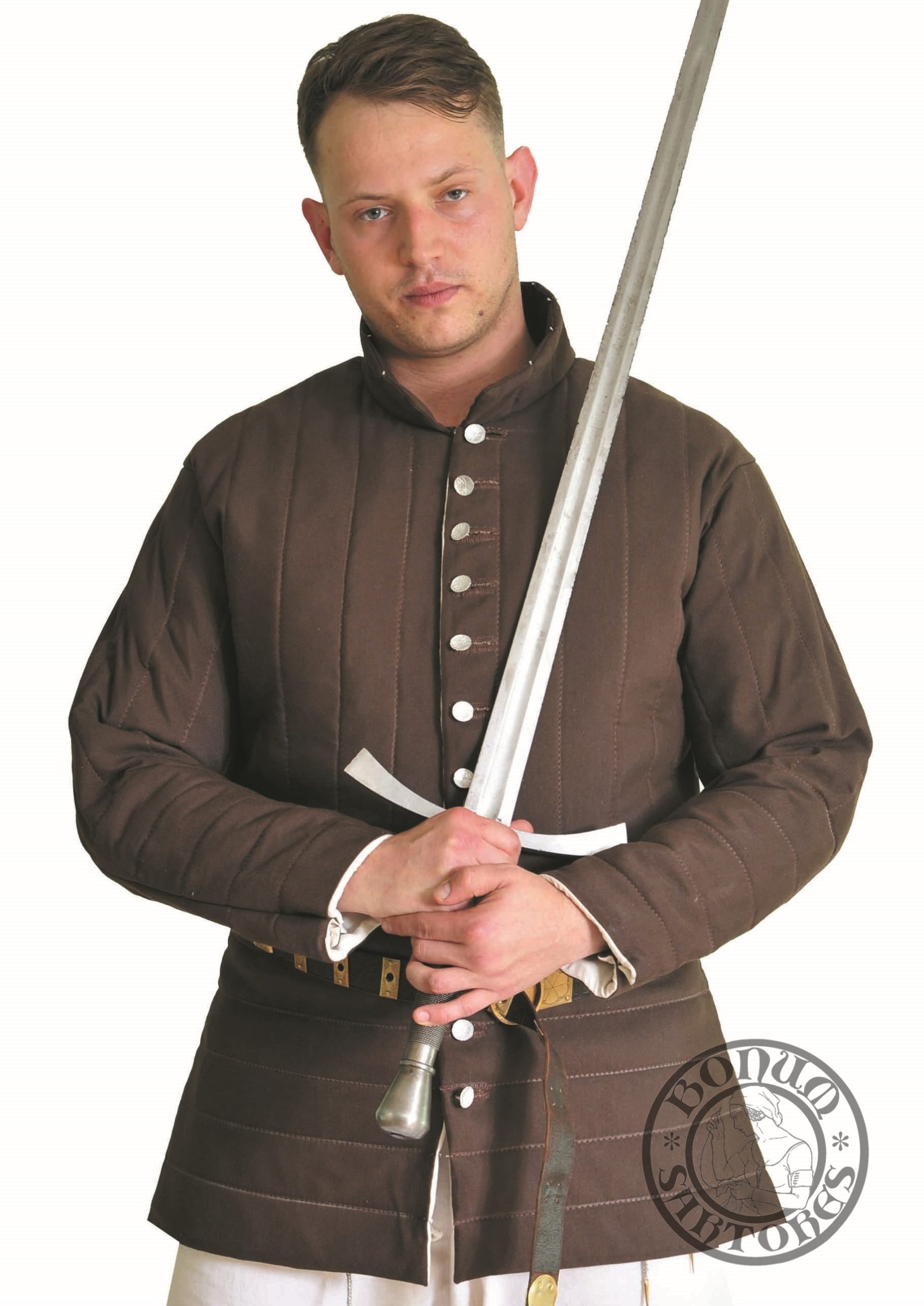 A gambeson inspired by popular iconographic depictions. It features a fitted cut and a collar. Quilted vertically on the upper section and horizontally on the lower section. It reaches mid-thigh. Fastened with 10-14 buttons (depending on size).