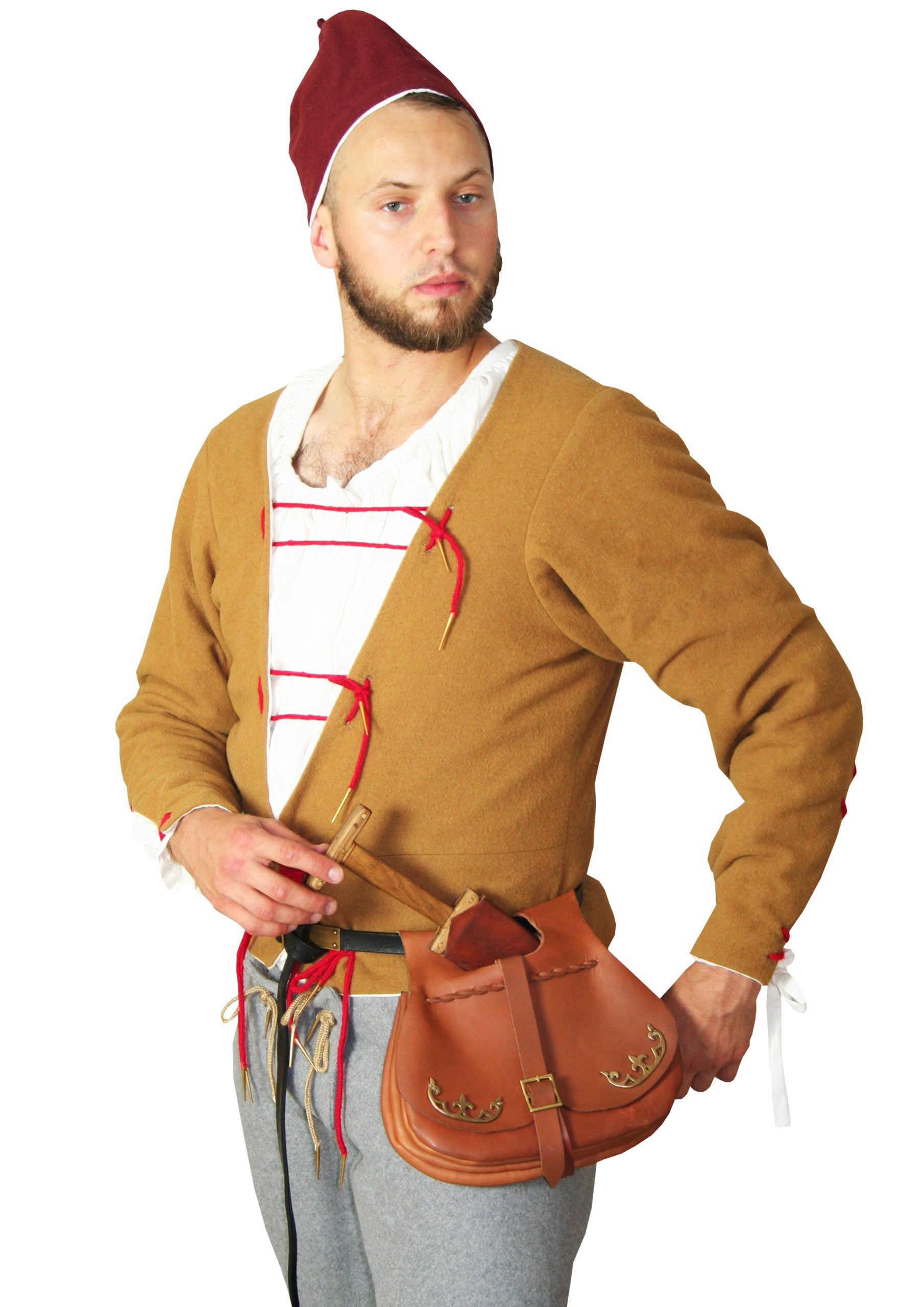 This fitted woolen doublet accentuates the figure while also serving a practical purpose – supporting the legs. Made of wool with a linen lining.