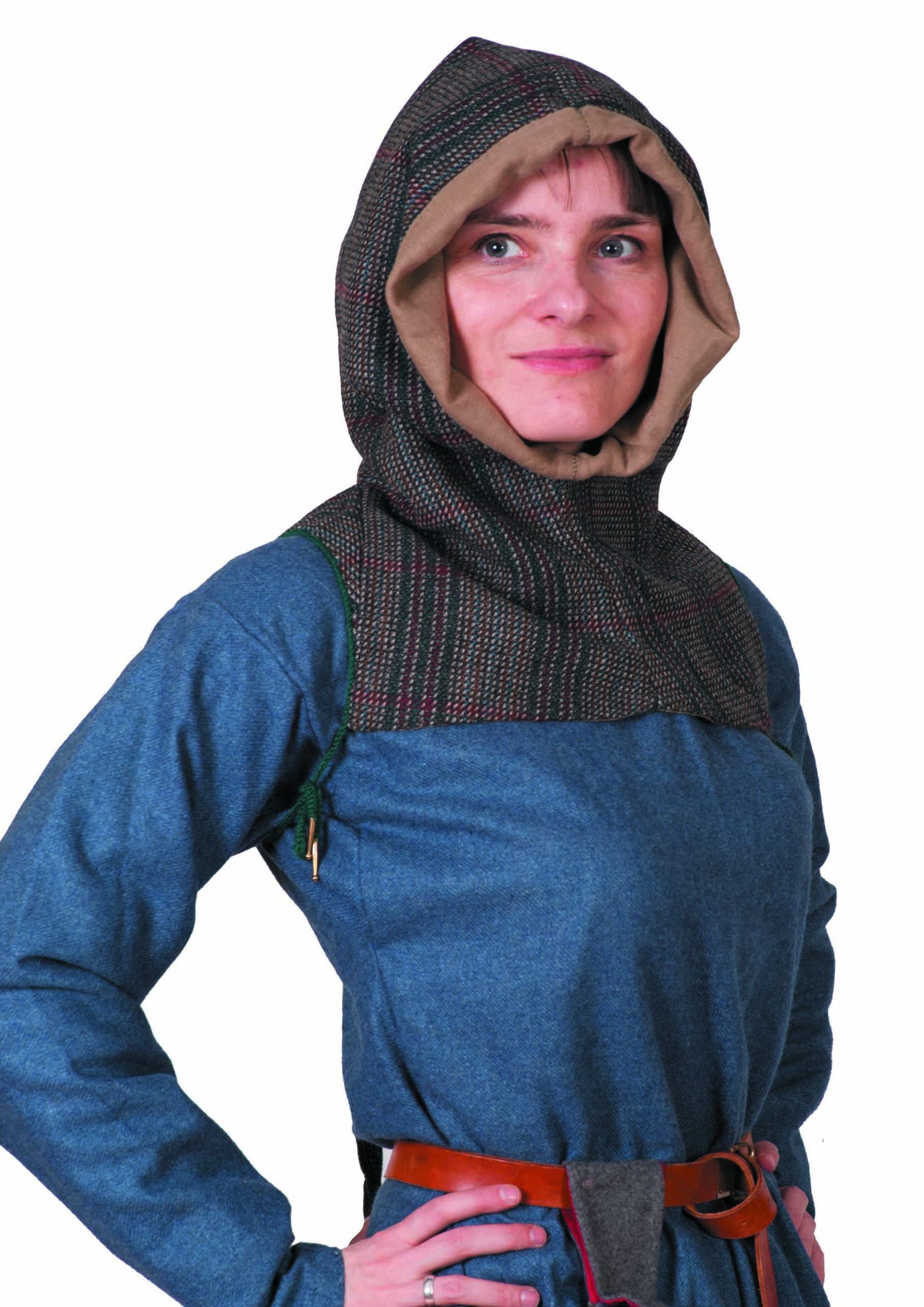 Medieval headgear – a hood popular in the 14th century, cut in two pieces and widened with gussets. It ties under the arm with handmade woolen cords and aglets.
