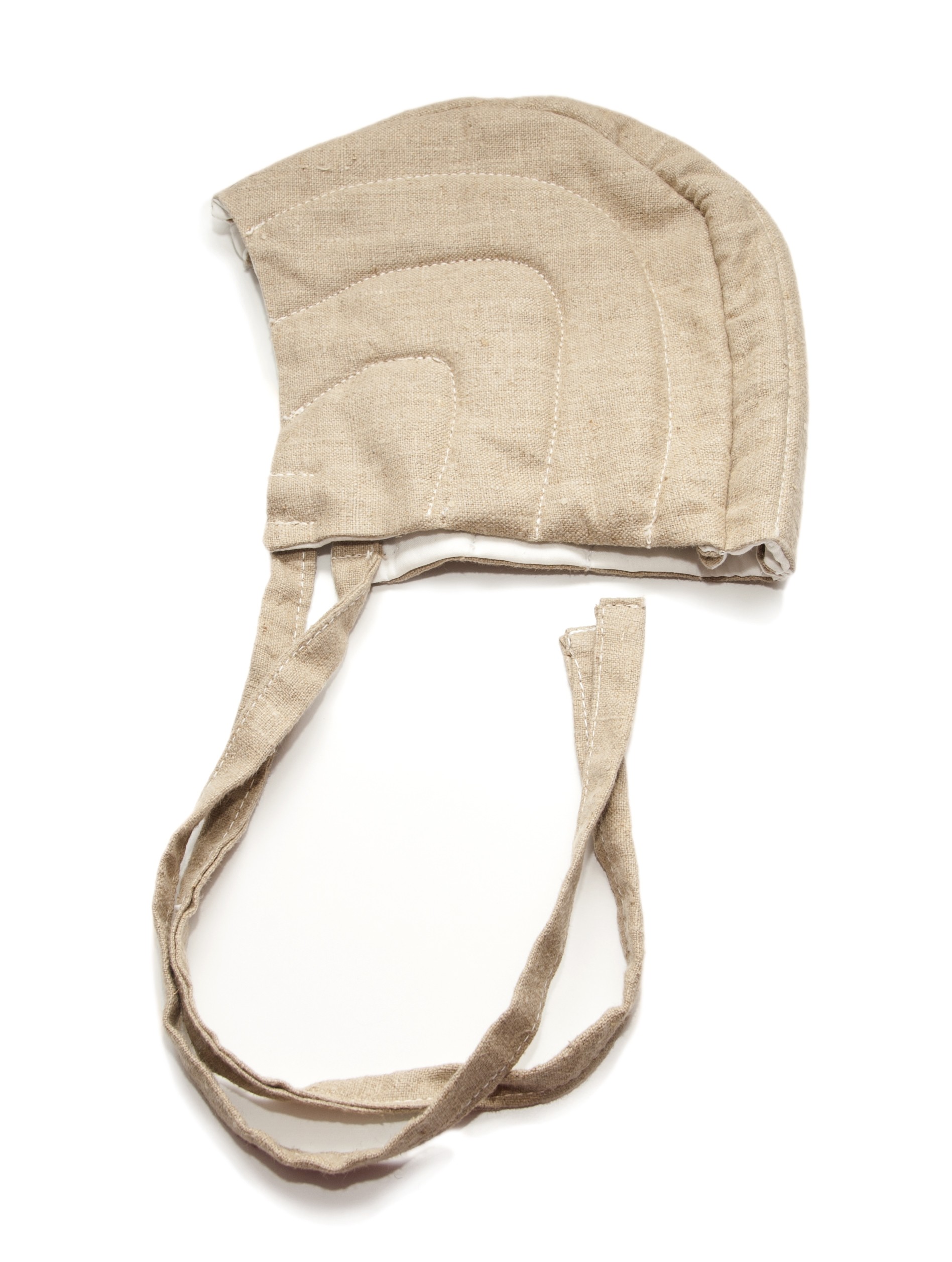 Quilted cap – basic head protection, worn under a helmet or on its own. Ties at the neck.