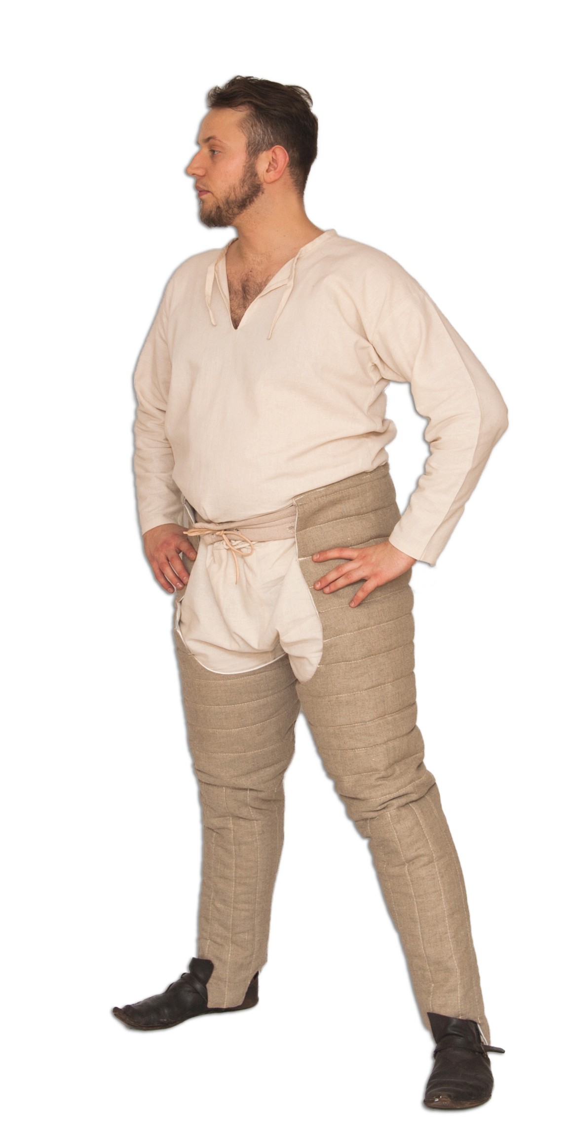 Quilted hose was a basic element of medieval protective clothing. Made of linen, with natural wool padding.
