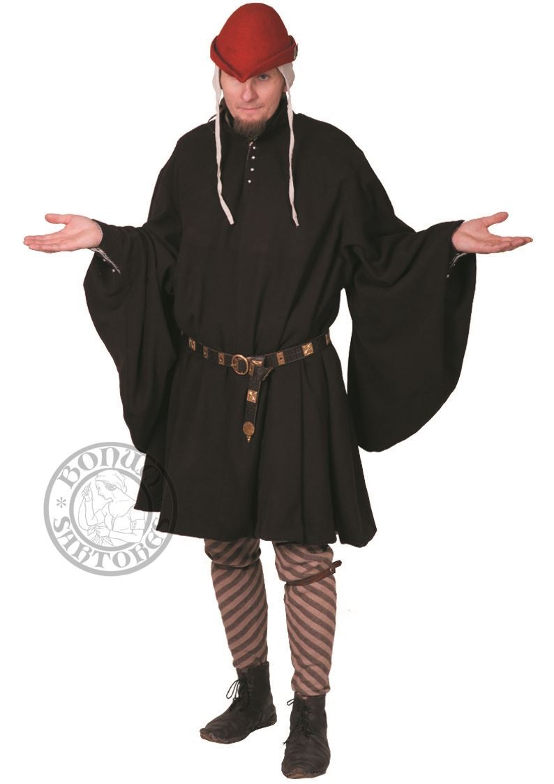 The robe is made of wool, lined with linen, and has a collar. The robe fastens with six buttons at the neck and three buttons on the sleeves. The sleeves are quite long, baggy, and taper at the wrist. This medieval garment typically reaches to the knee.