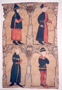 In the 14th century, more diverse cuts began to appear, often tailored to the figure. Cloaks became more elegant and a staple of courtly fashion. In the 15th century, the houppelande—a voluminous outer garment with deep pleats, a high collar, and wide sleeves, often adorned with fur or cut-out edges—became particularly popular. During this period, cloaks were made of high-quality cloth and velvet, emphasizing the wearer’s wealth and status.