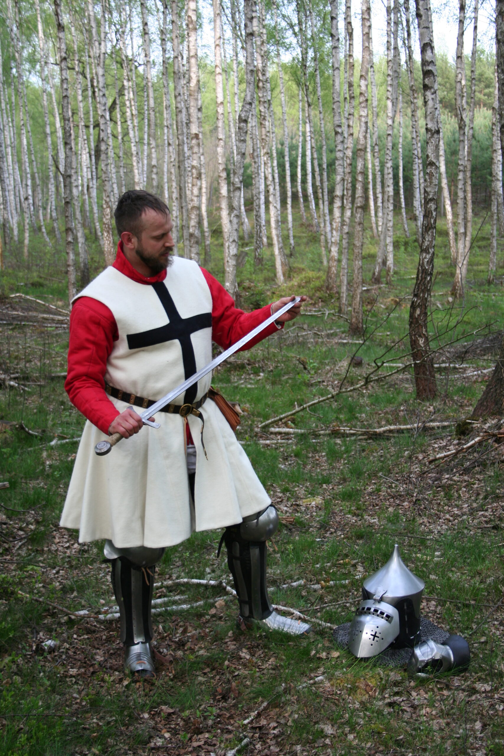 A simple armor robe for Teutonic Knights reenactors. Made of wool with a linen lining. Sleeveless. With slits at the front and back for ease of movement. Wool appliqué in the form of a cross.