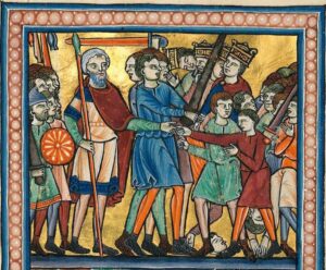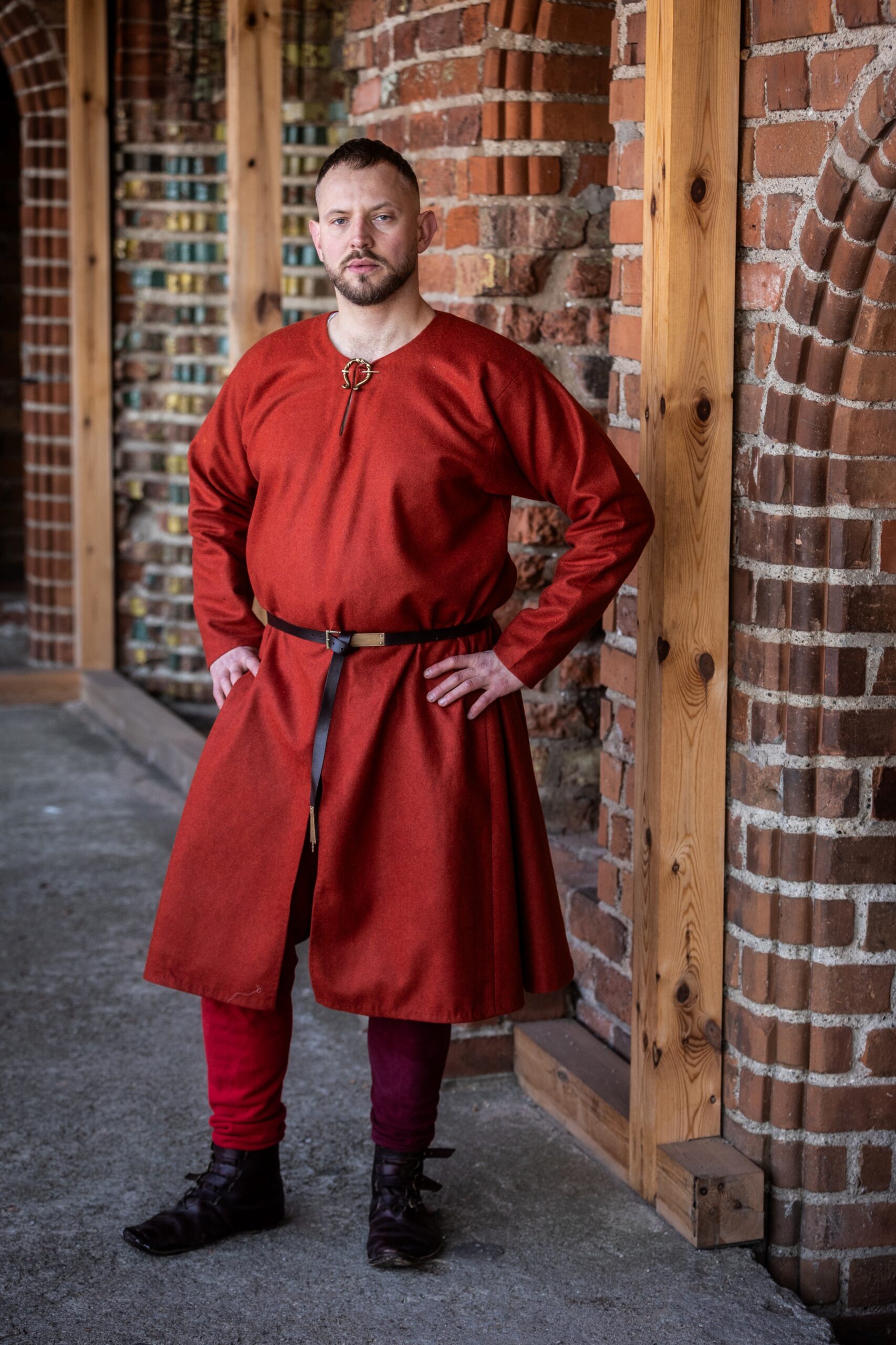 In the early Middle Ages, the tunic was simple, loose, and reached to the knees or calves. Made of linen or wool, tied with a belt, it constituted the everyday attire of most men. On colder days, a second, thicker tunic was worn, along with a cloak fastened with a brooch.