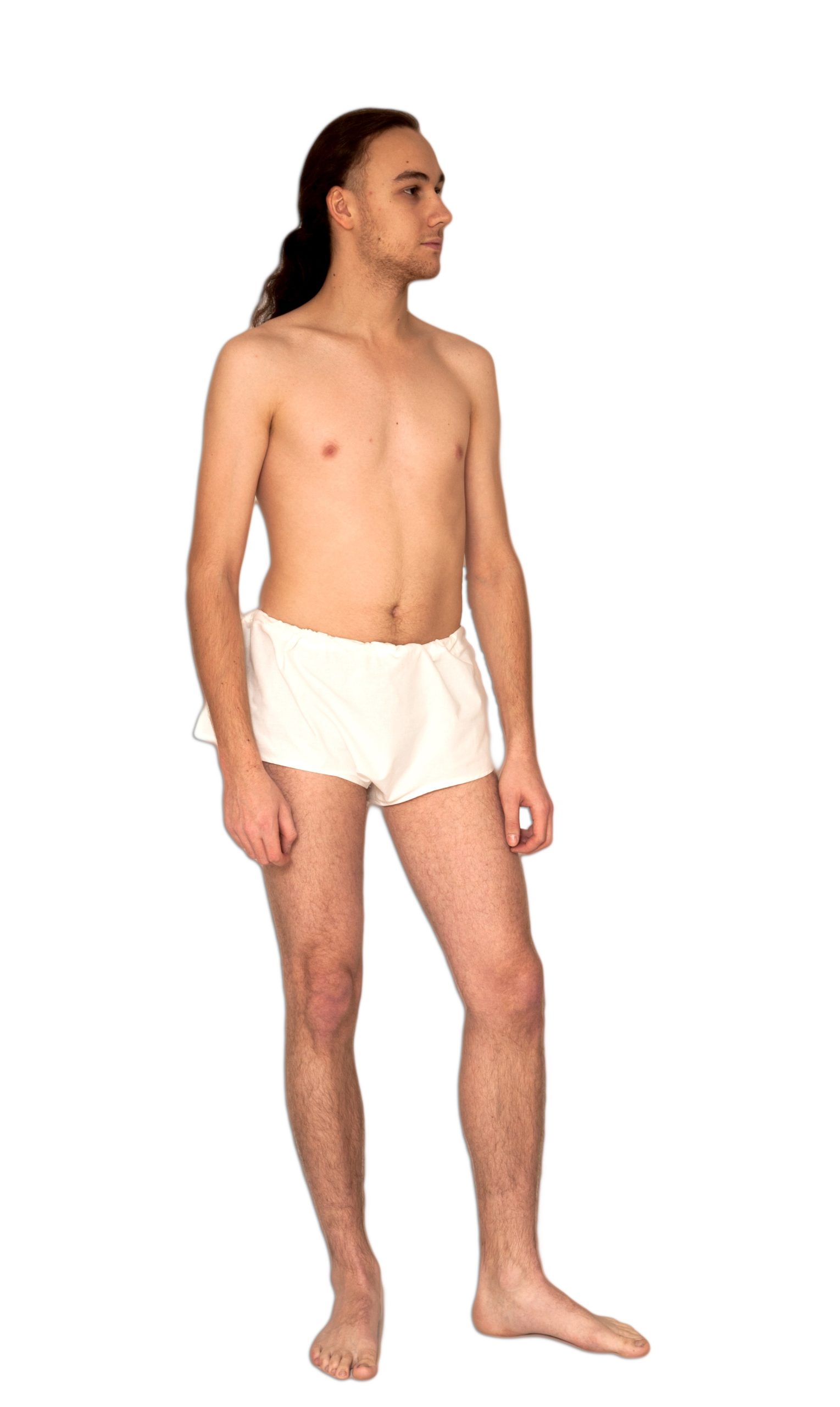 Średniowieczna bielizna: gacie krótkie do połowy uda, krojone w części. Wiązane na bawełniany sznurek bez skuwek.