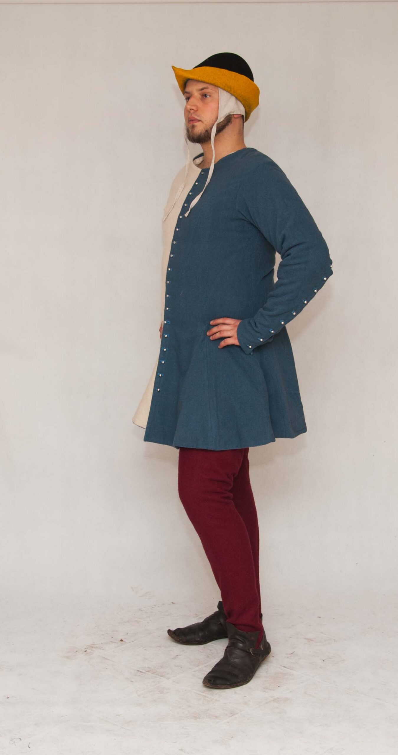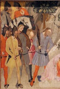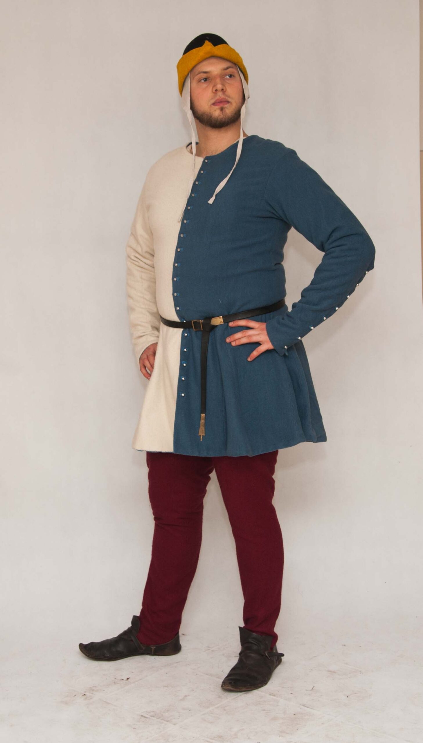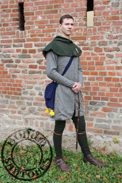 Słowa kluczowe: stroje męskie średniowieczne, tunika, dublet, płaszcz, nogawice, moda średniowieczna, rekonstrukcja historyczna, odzież historyczna, XIV wiek, XV wiek